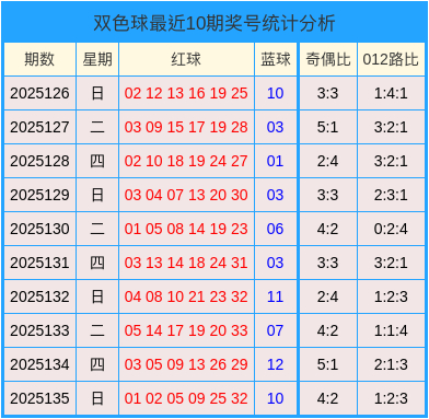 开奖回顾:第2025135期双色球开奖号码为:01、02、05、09、25、32+10。奇偶比为4:2,012路比为1:2:3。