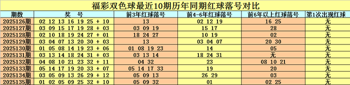 开奖回顾:福彩双色球第2025135期奖号为:01 02 05 09 25 32 + 10。其中红球前1-3期落号:05 09 32,前4-6期落号:01,6期以前落号:02 25。