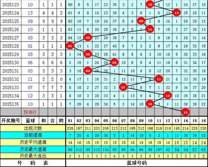蓝球分析:去年同期开出蓝球号码03,该号码在历史同期奖号中出现了2次,表现比较活跃,今年同期可以继续关注历史同期已开出的蓝球号码,参考号码14。